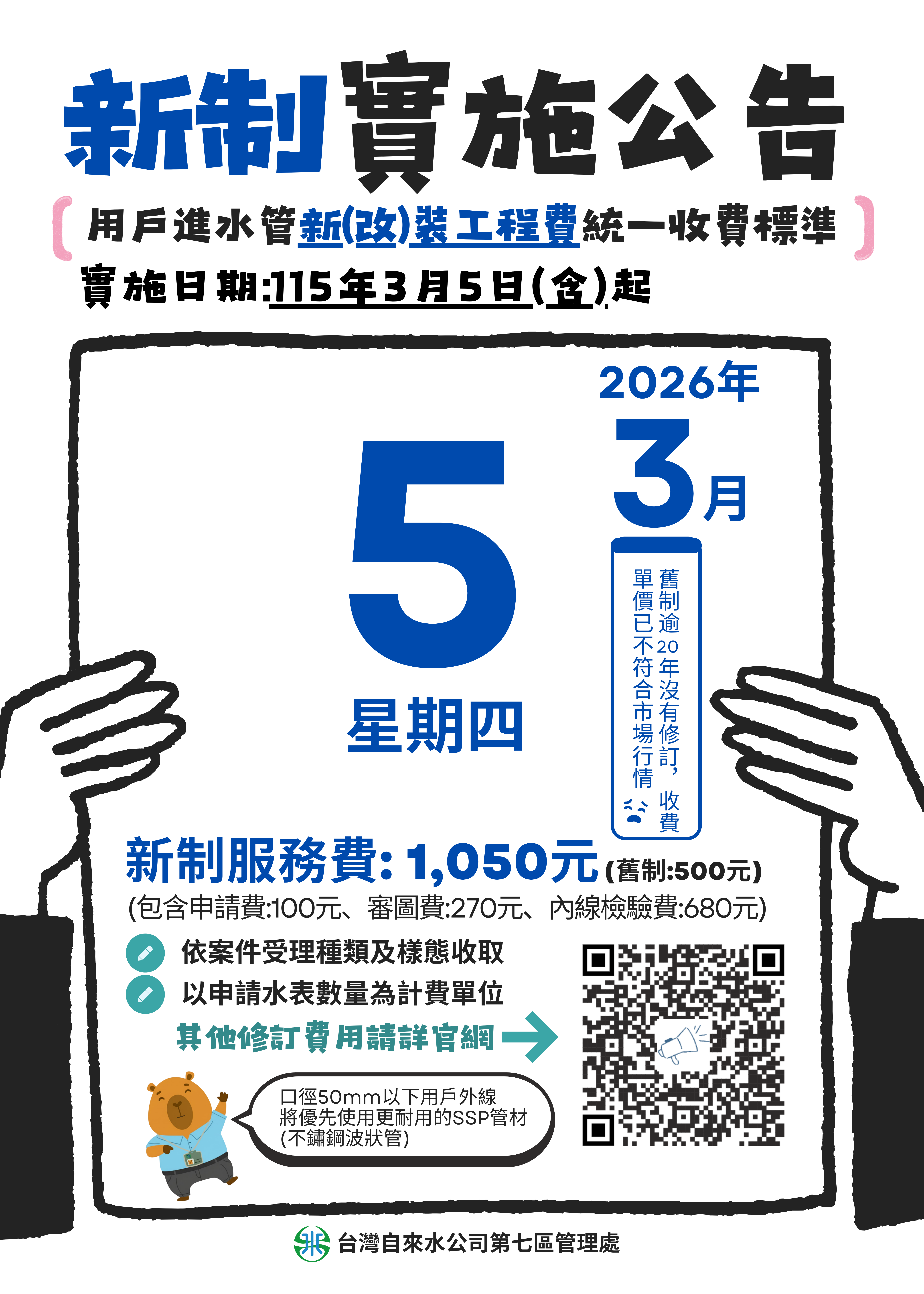 主旨:函轉台灣自來水股份有限公司第七區管理處辦理新版 「用戶進水管新(改)裝工程費收費標準表」案,請查照。 說明:一、依台水七業字第1150002455號函辦理。 二、隨函檢附台水七業字第1150002455號函及意見表。 三、新版「用戶進水管新(改)裝工程費收費標準表」宣導 文宣、簡報及用戶版問答集請至本處官網參閱下載。 https://kaohsiungoffice.waterpipe-net.org.tw/ 四、115年3月5日實施後,會員如有相關問題及意見, 請於3月30日前填寫意見表傳真至本處,匯整後將函報 台灣自來水股份有限公司第七區管理處以利後續回應。 |